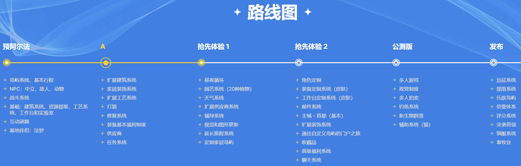 岛屿除了可以访问游戏，还具有独特的外观，与基本的家园岛完全不一样。此外还增加容量，可以建造更多的建筑，如生产设施，豪华房子等。此外群岛将设有神器插槽。这些插槽决定了您可以在工作台旁边安装多少神器。这些神器将在收藏品制作中发挥作用。