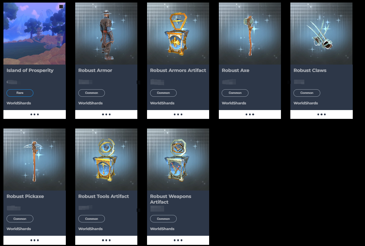 1.NFT配置：蓝色创始人岛屿➕1个白色武器神器➕1个白色盔甲神器➕1个白色工具神器➕1个白色武器➕1个白色盔甲➕1个白色稿头➕1个白色斧头
